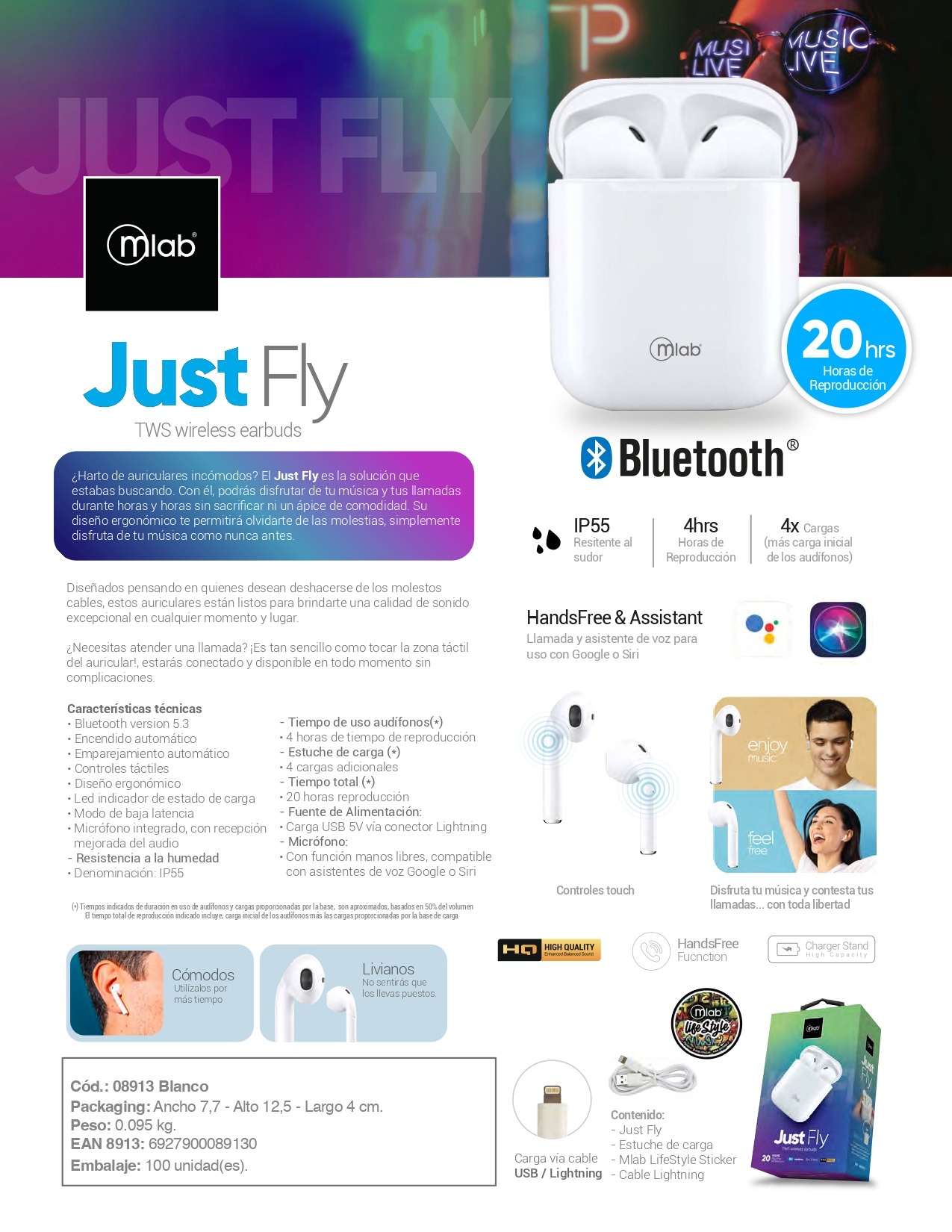 Audífonos TWS Just Fly Bluetooth White Mlab
