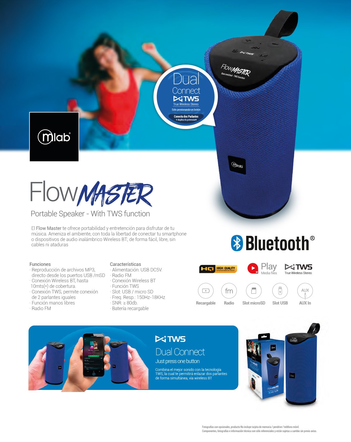 El Flow Master te ofrece portabilidad y entretención para disfrutar de tu música. Ameniza el ambiente, con toda la libertad de conectar tu smartphone o dispositivos de audio inalámbrico Wireless BT; de forma fácil, libre, sin cables ni ataduras.